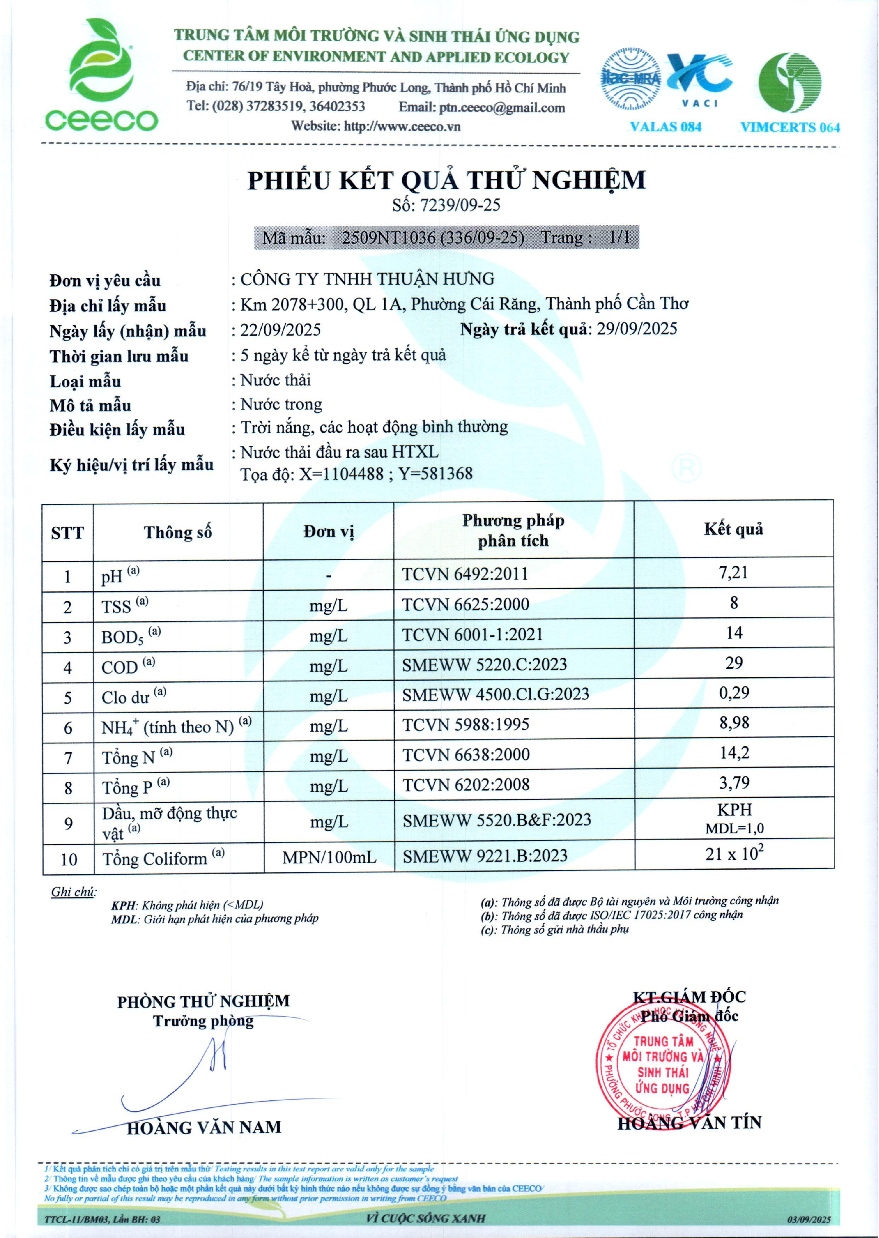 KẾT QUẢ QUANG TRẮC MÔI TRƯỜNG THUẬN HƯNG QUÝ 3 NĂM 2025